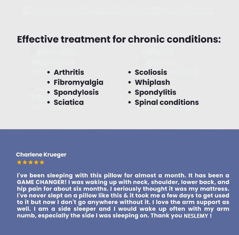 Ergonomic Relief Pillow designed to support your neck and spine all night long.
